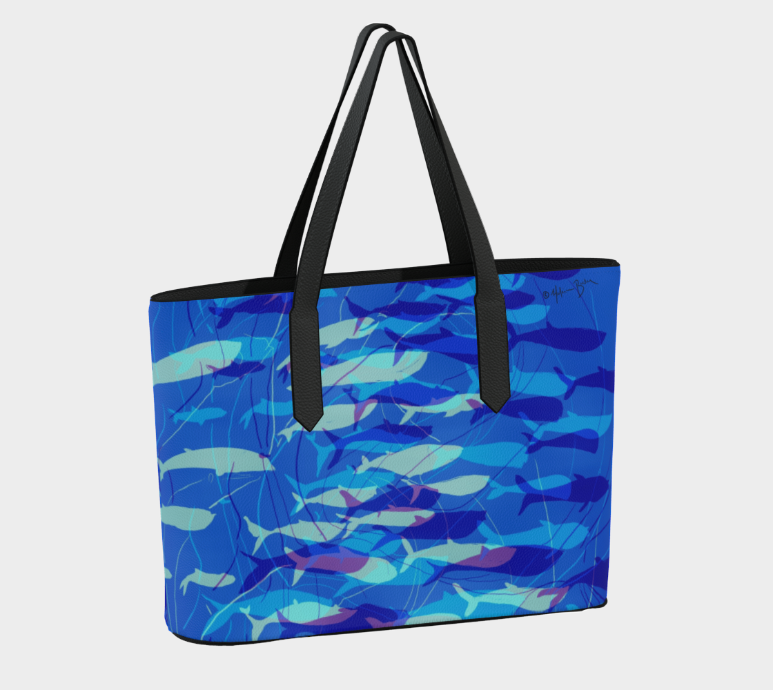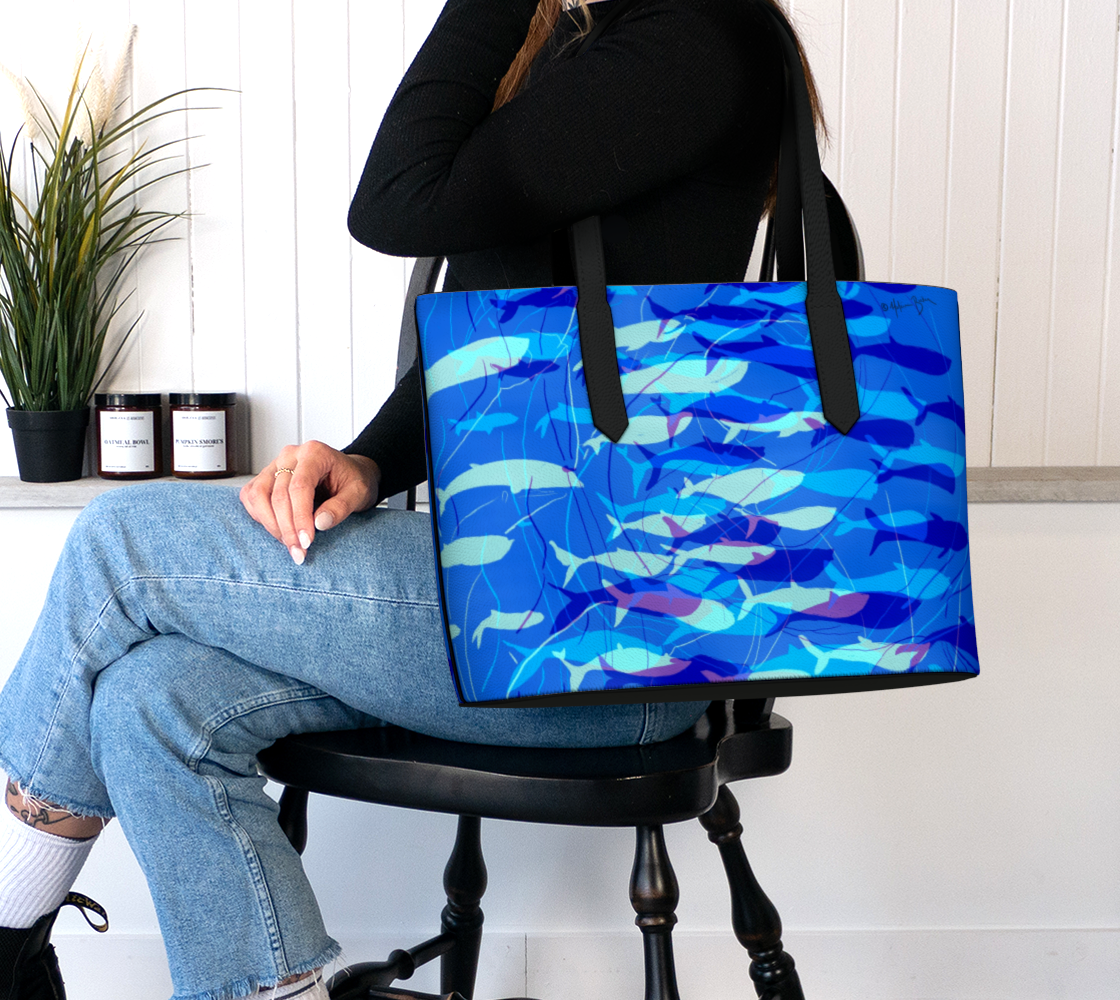 Whether you're going to work, school, the gym or on vacation, bring some whale-sized flair to your day with this practical - and beautiful! - bag from the Blue Whale Collection for Fall '23. This vegan leather tote is perfect for everyday grab-n-go. Custom made from textured vegan pebble leather with inner pockets and professional finishing, the bag is large enough to fit a 16” laptop but not so large as to weigh you down. Featuring full color permanent print with UV inks, each tote bag is custom-made just for you. Quality materials and construction make every piece strong and durable enough to keep up with your busy lifestyle.